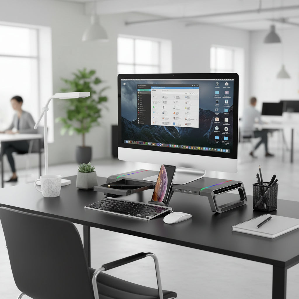 Passez au setup du futur. Le MovaHub n'est pas un simple support d'écran, c'est le centre de contrôle de votre bureau. Alliez ergonomie de pointe, technologie sans fil et design immersif.
